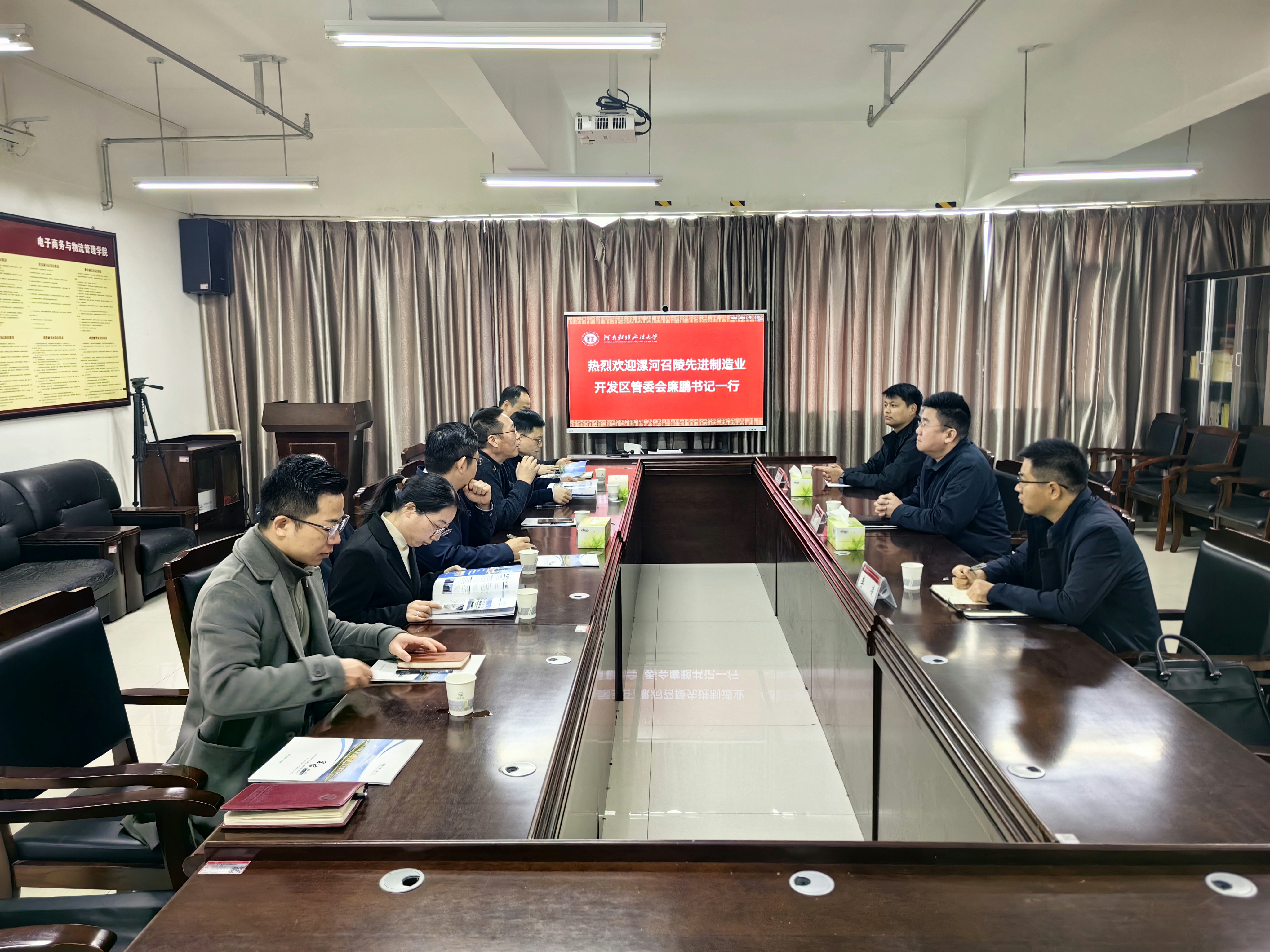 11月27日上午,漯河召陵先进制造业开发区管委会书记兼主任廉鹏带领管委会班子成员一行莅临我院进行座谈交流。学院院长崔春生、副院长史晓东及部分老师等出席此次座谈活动,会议由史院长主持。与会人员围绕数字经济与电商产业发展、公共数据资源开放、人才交流、校企合作、科研成果转化等方面开展了深入交流。