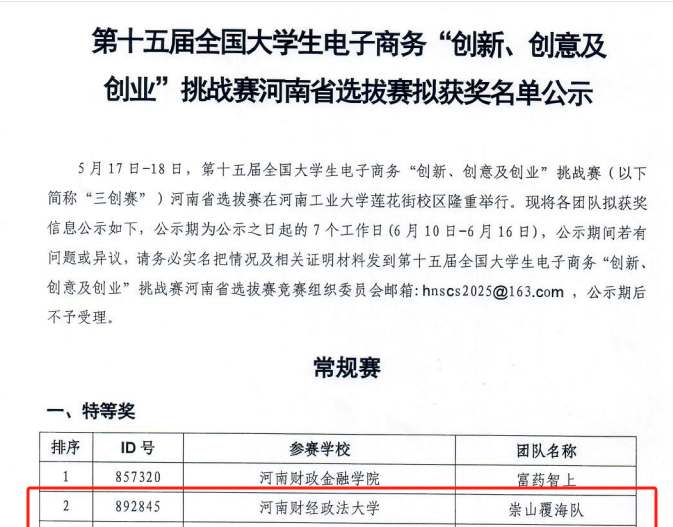 近日,第十五届全国大学生电子商务“创新、创意及创业”挑战赛(以下简称“三创赛”)河南省选拔赛决赛结果公布,我校入围省赛的5支队伍在全省71所高校10631支参赛队伍的激烈角逐中全部获奖,其中斩获常规赛特等奖1项,一等奖1项、二等奖1项,实战赛商务大数据分析赛道一等奖1项(无特等奖),实战赛跨境电商赛道二等奖1项(无特等奖)。我校荣获最佳组织奖,多名教师获评最佳指导教师奖,优秀指导教师奖。