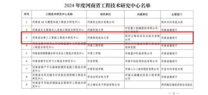 2025年1月8日,河南省科技厅印发了《关于认定建设2024年度河南省工程技术研究中心的通知》(豫科实〔2025〕1号),管理学部威廉williamhill申报的“河南省法律人工智能工程技术研究中心”成功获批立项建设。